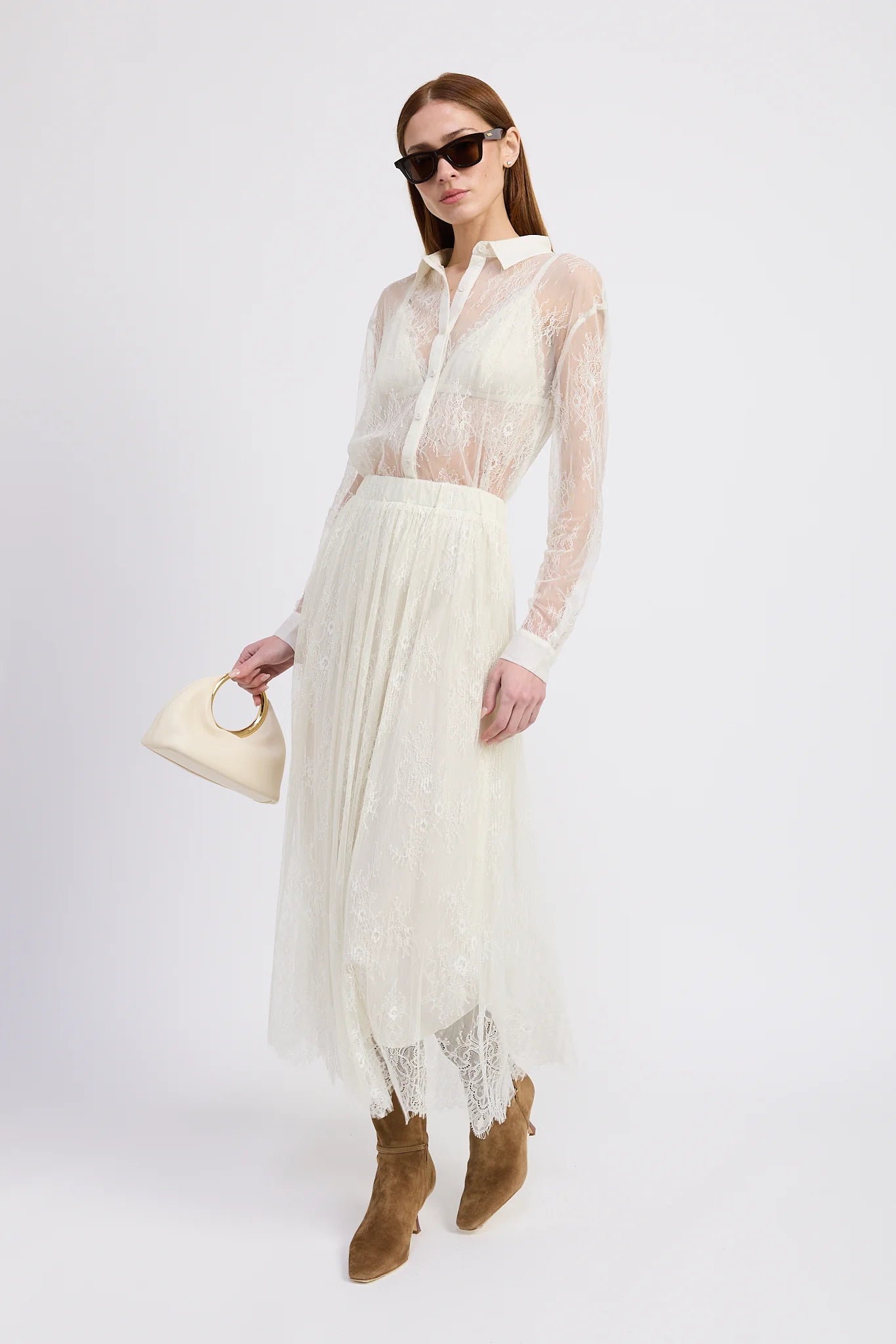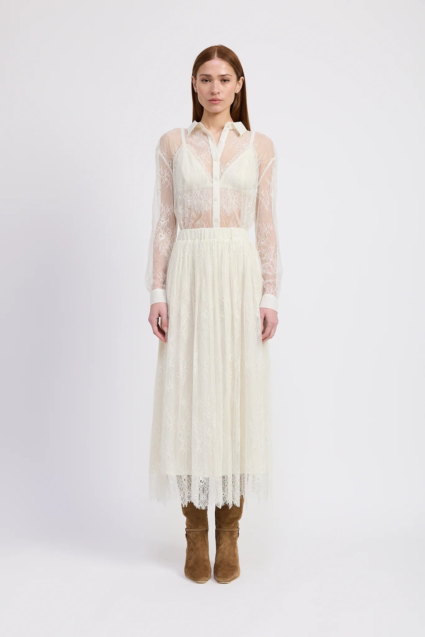Long sleeve button down top with bralette with matching midi lace skirt set.