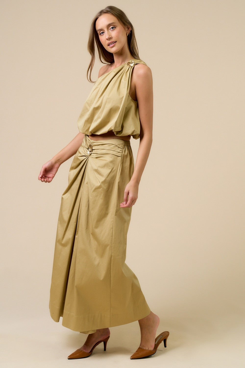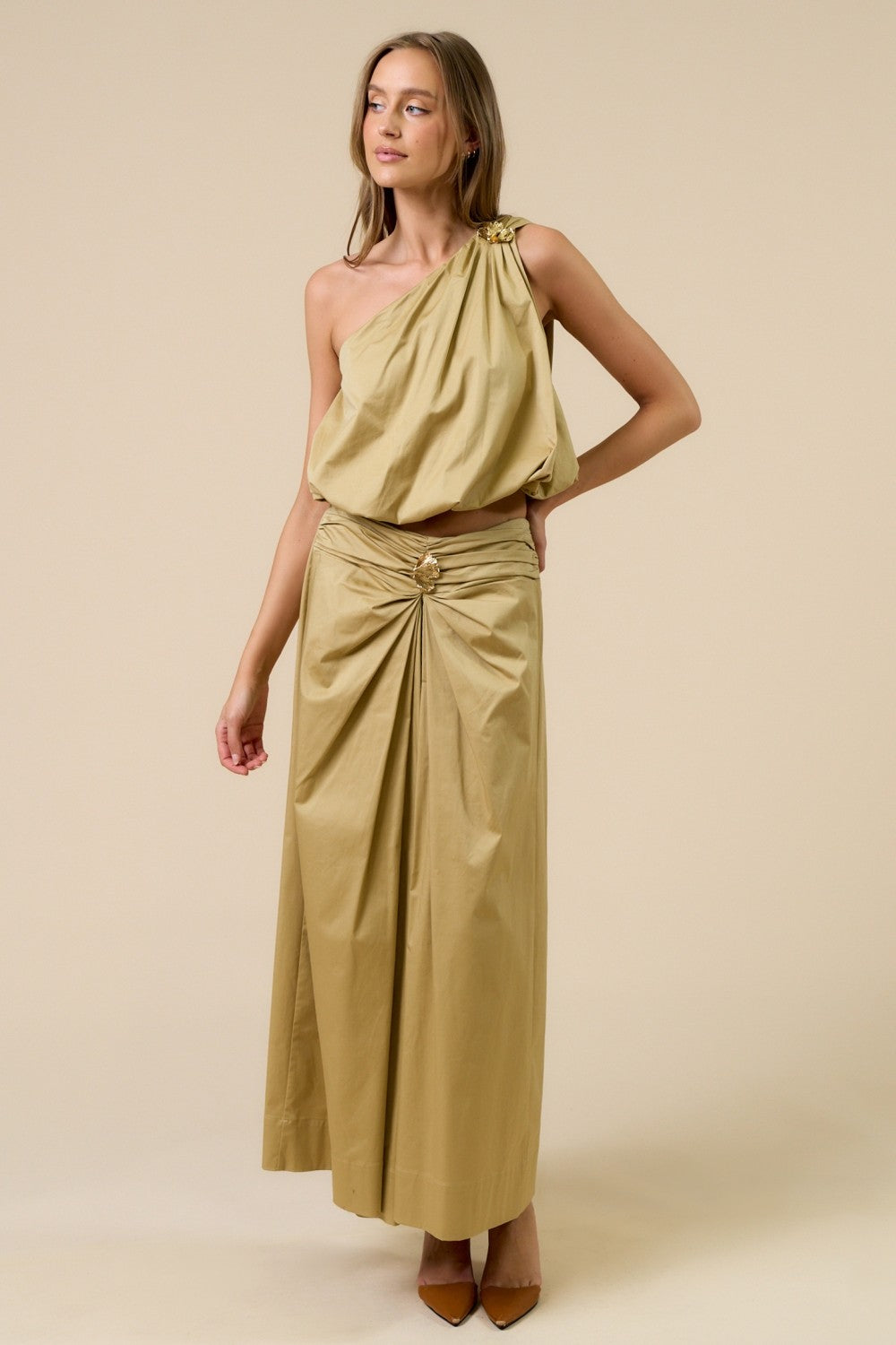 One shoulder bubble top with shirring maxi skirt with brooch detail set.