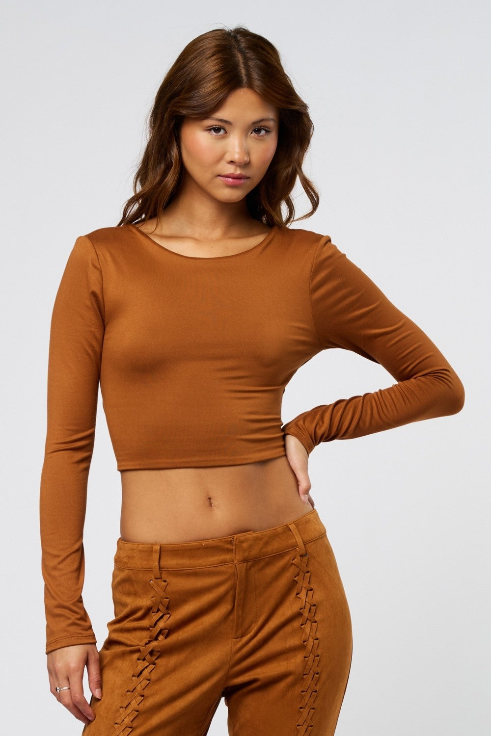 Long sleeve knit top with adjustable open back.