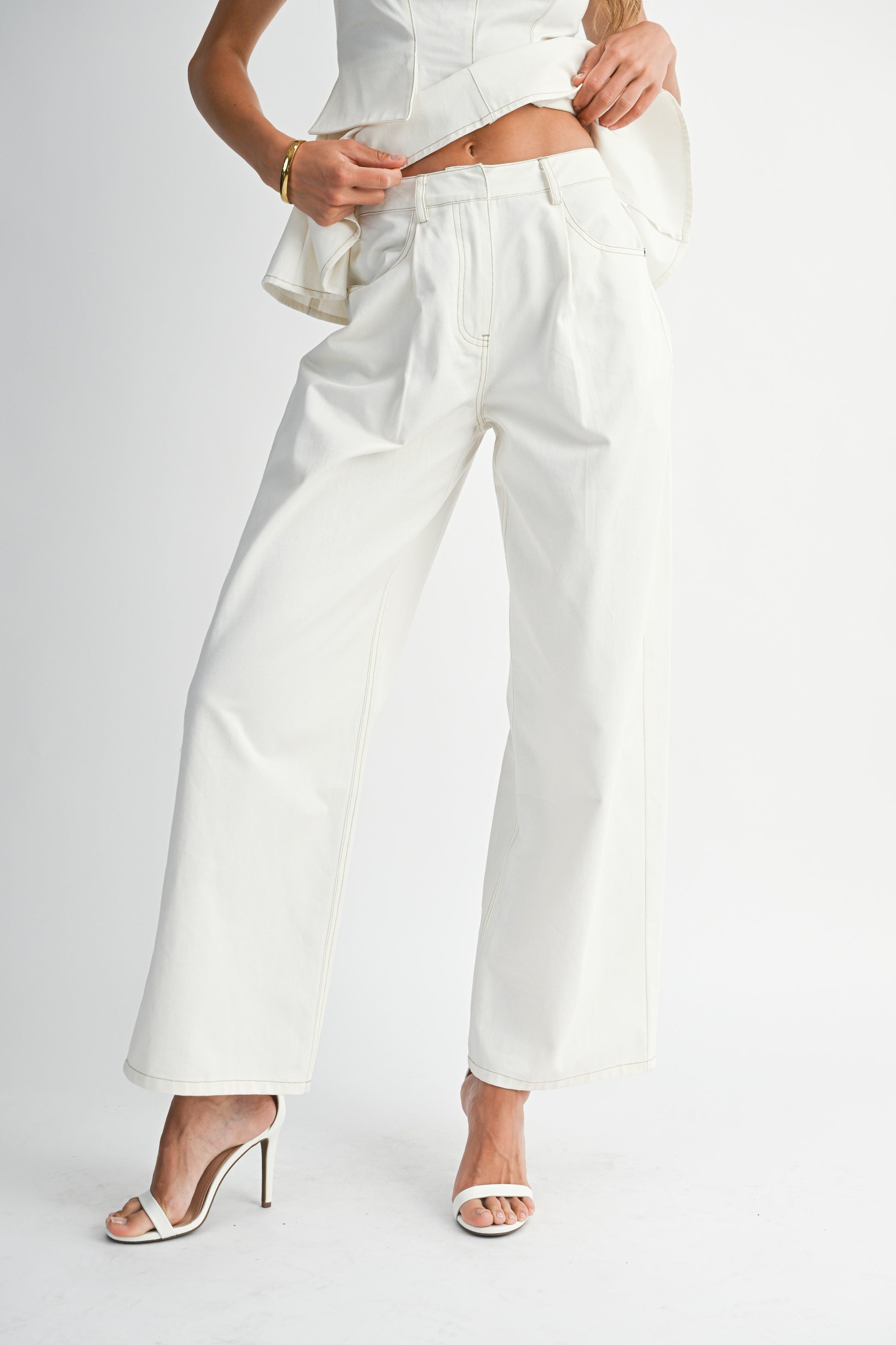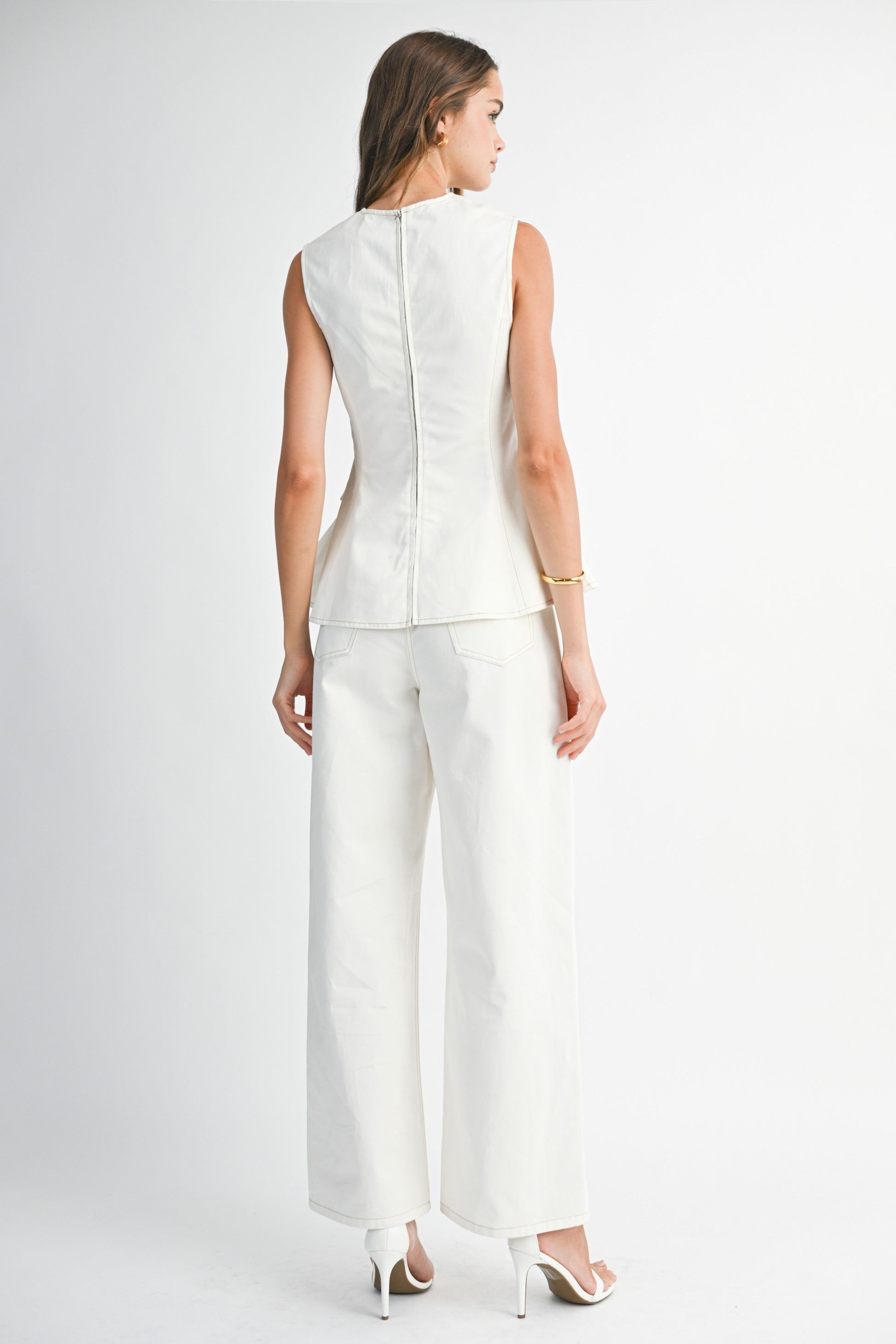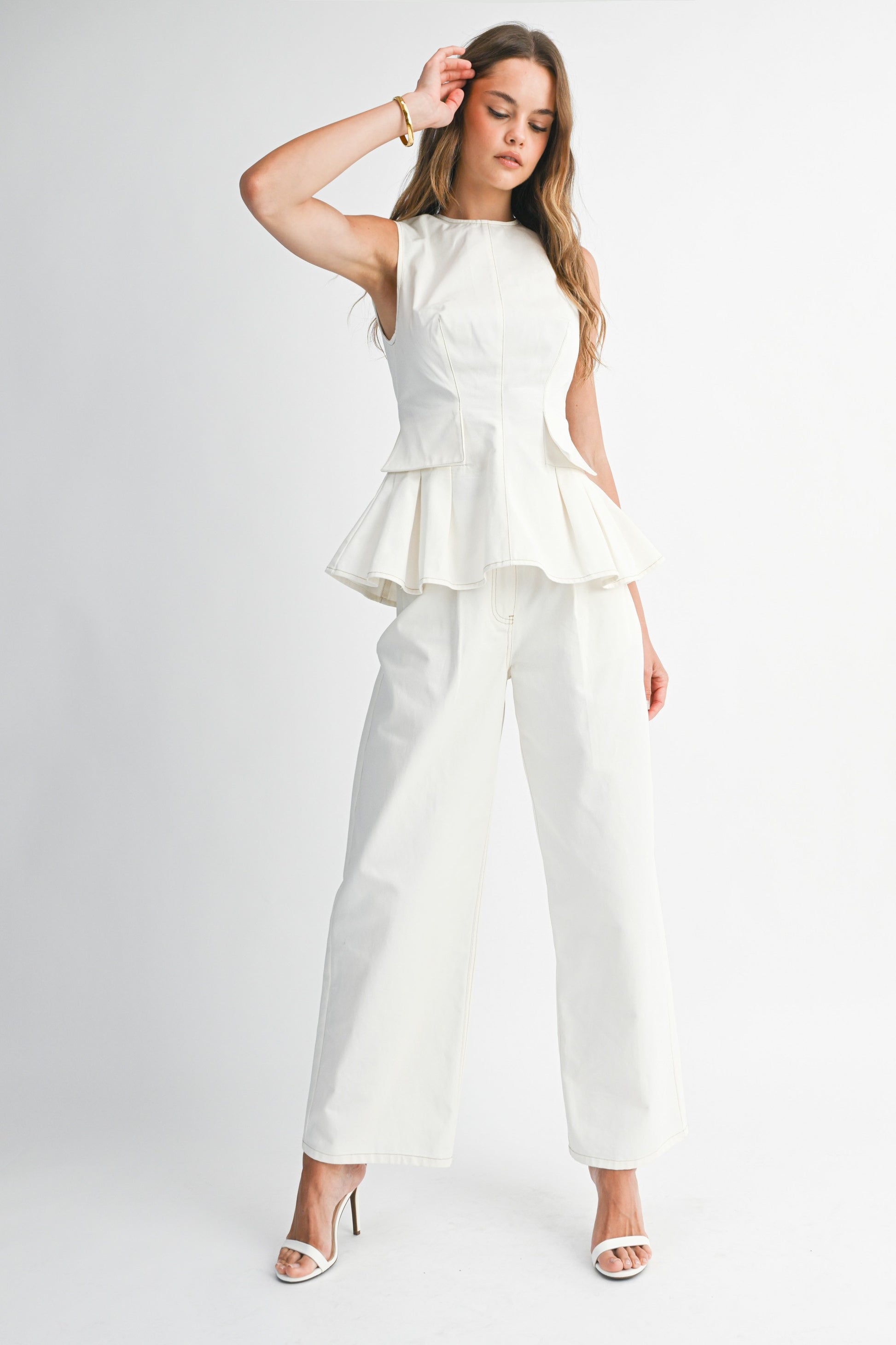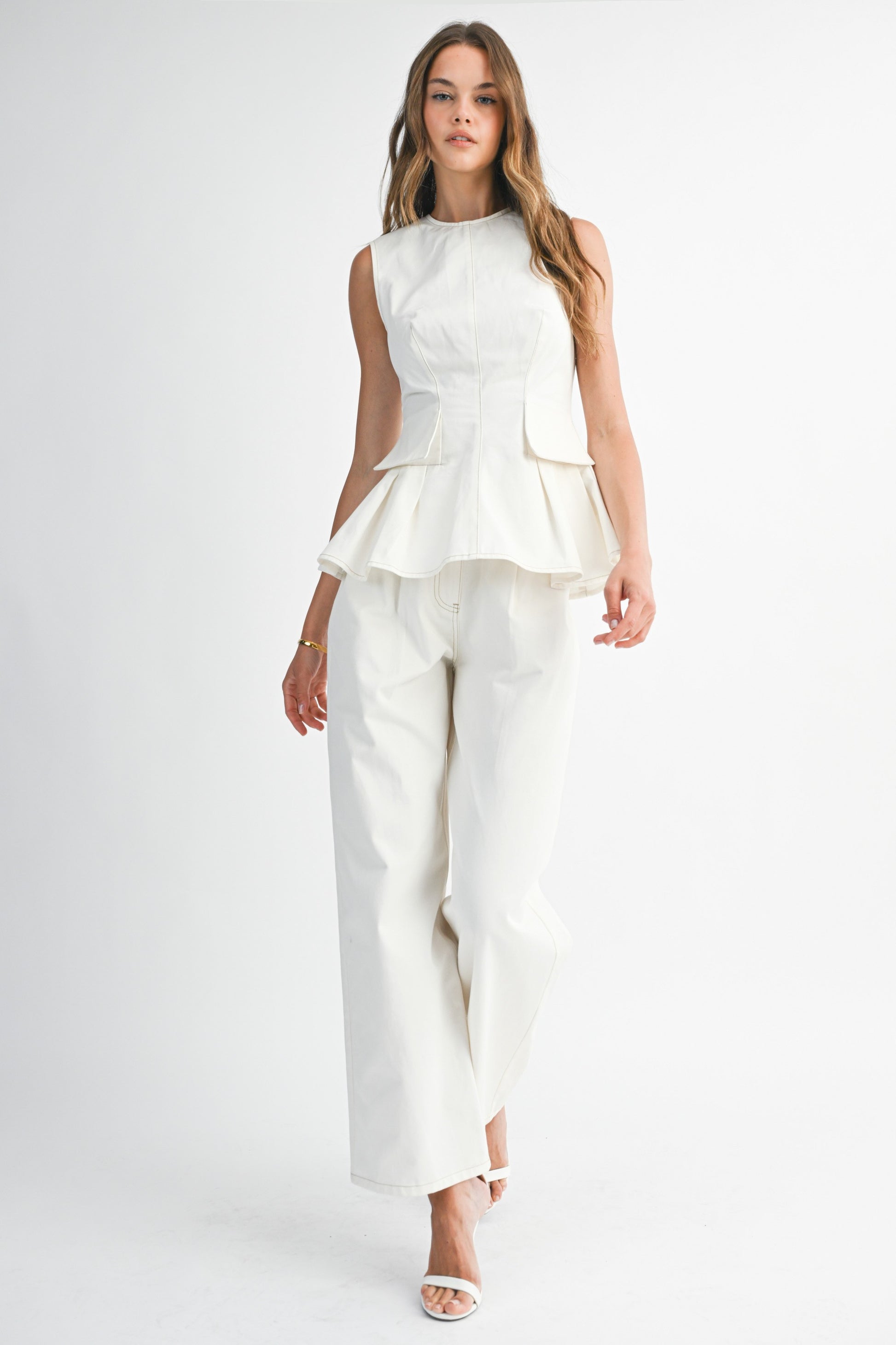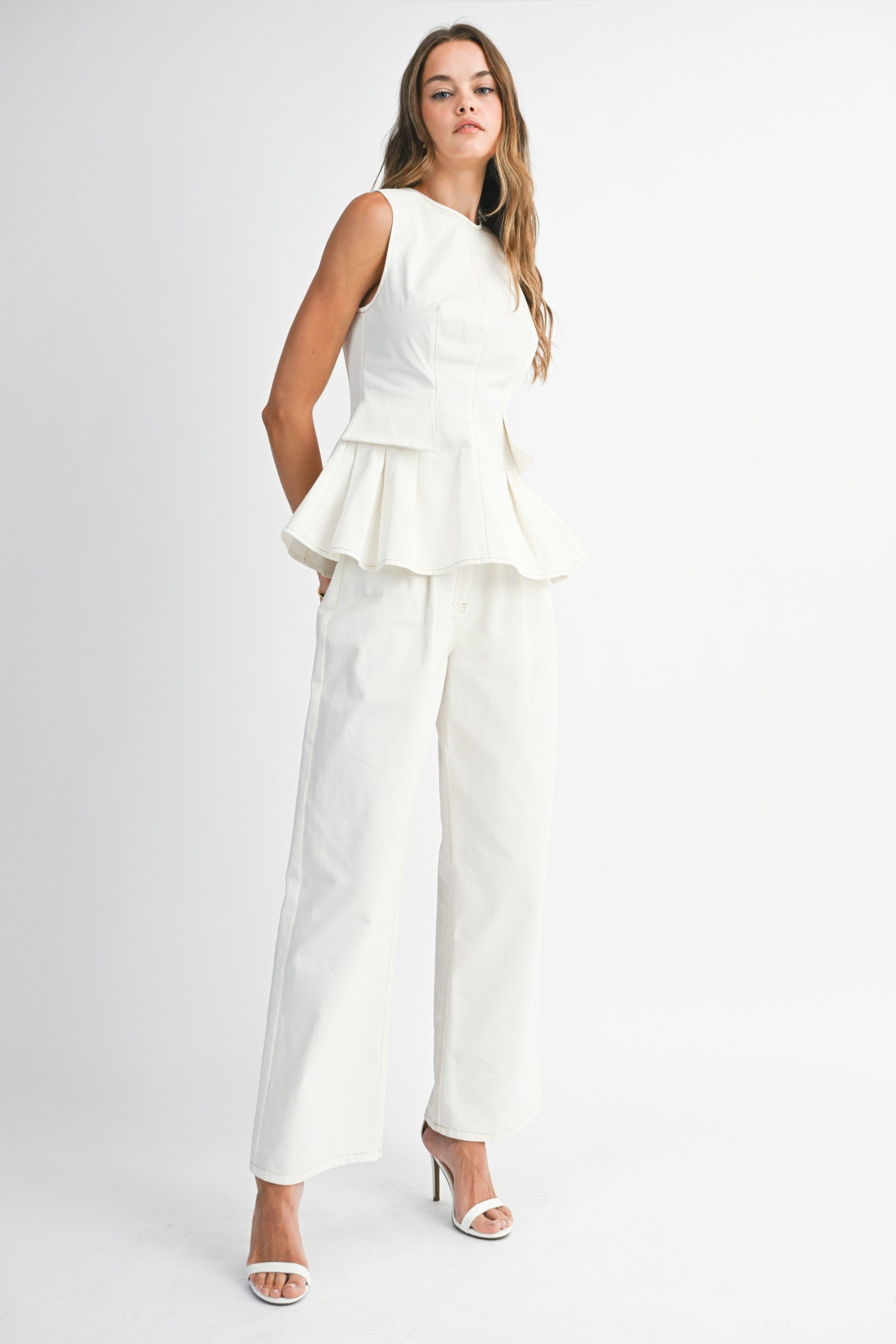 Peplum sleeveless top and straight pant set.