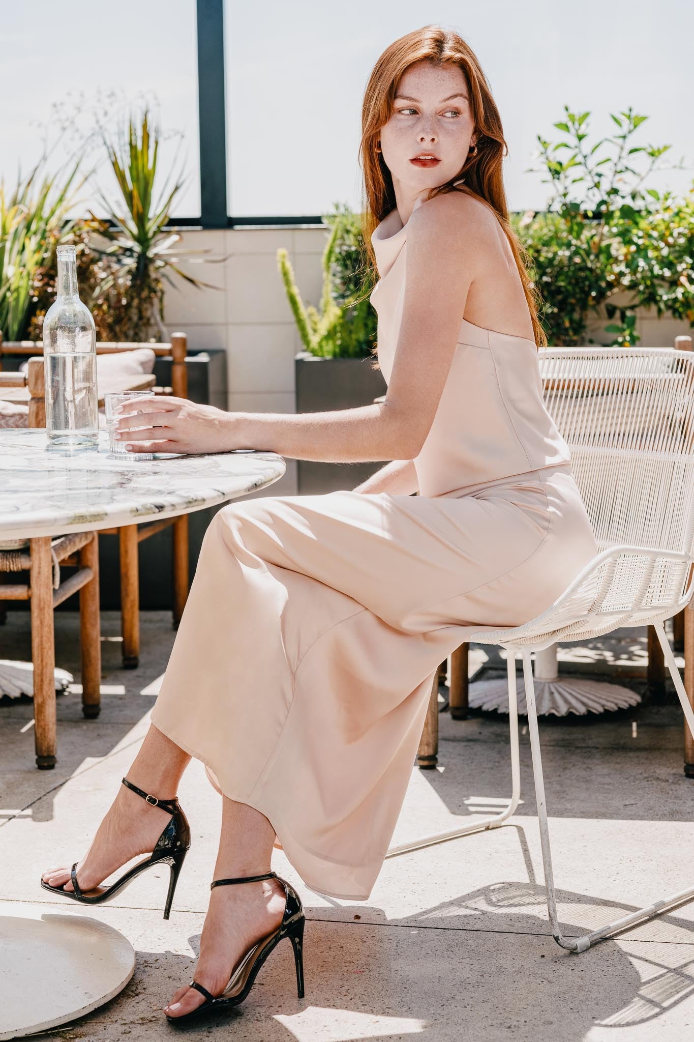 Satin cowl halter top with matching slip skirt set.