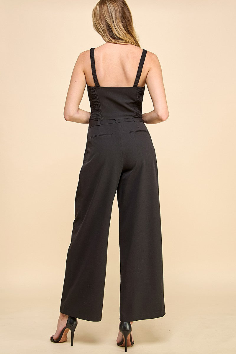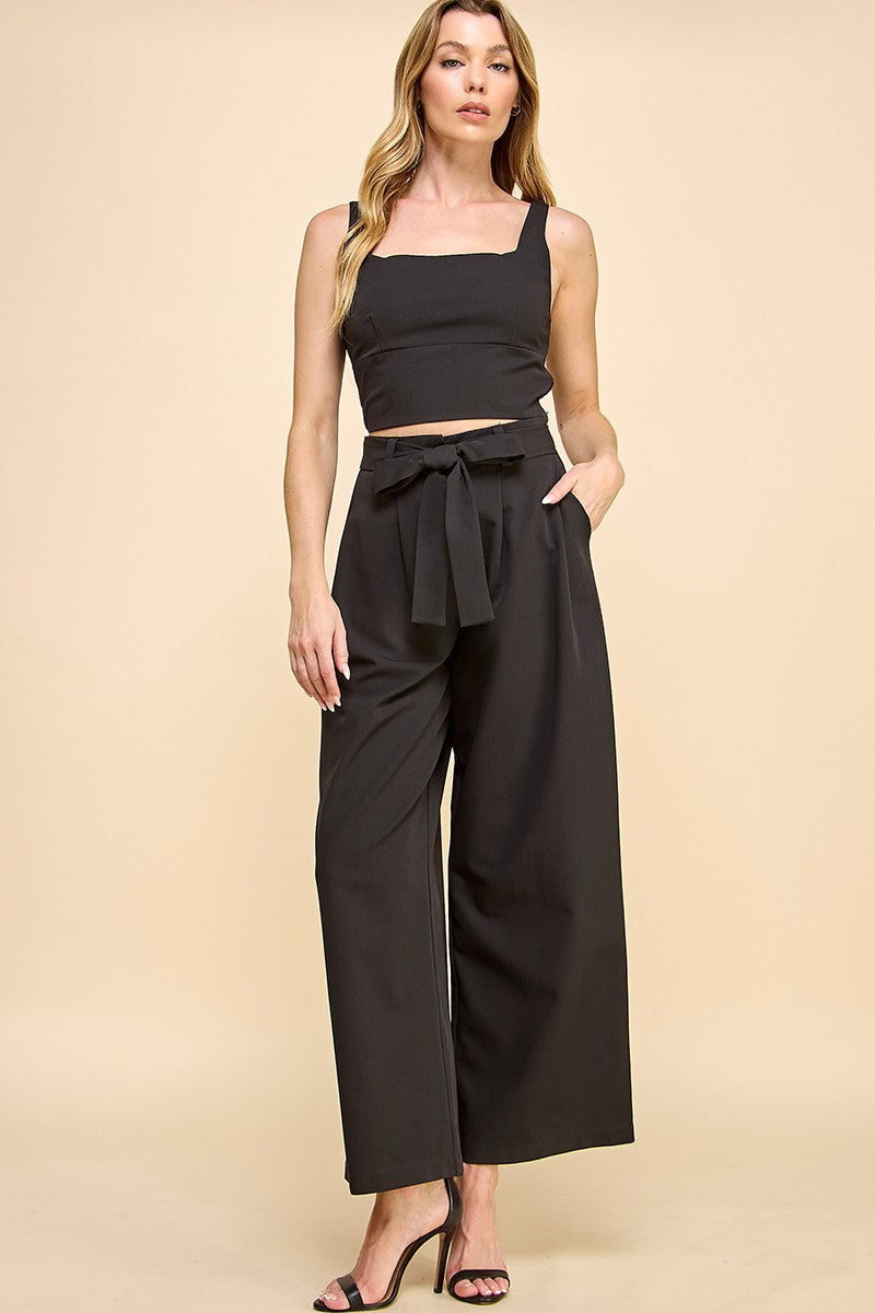 Cropped top with matching belted wide leg pant.