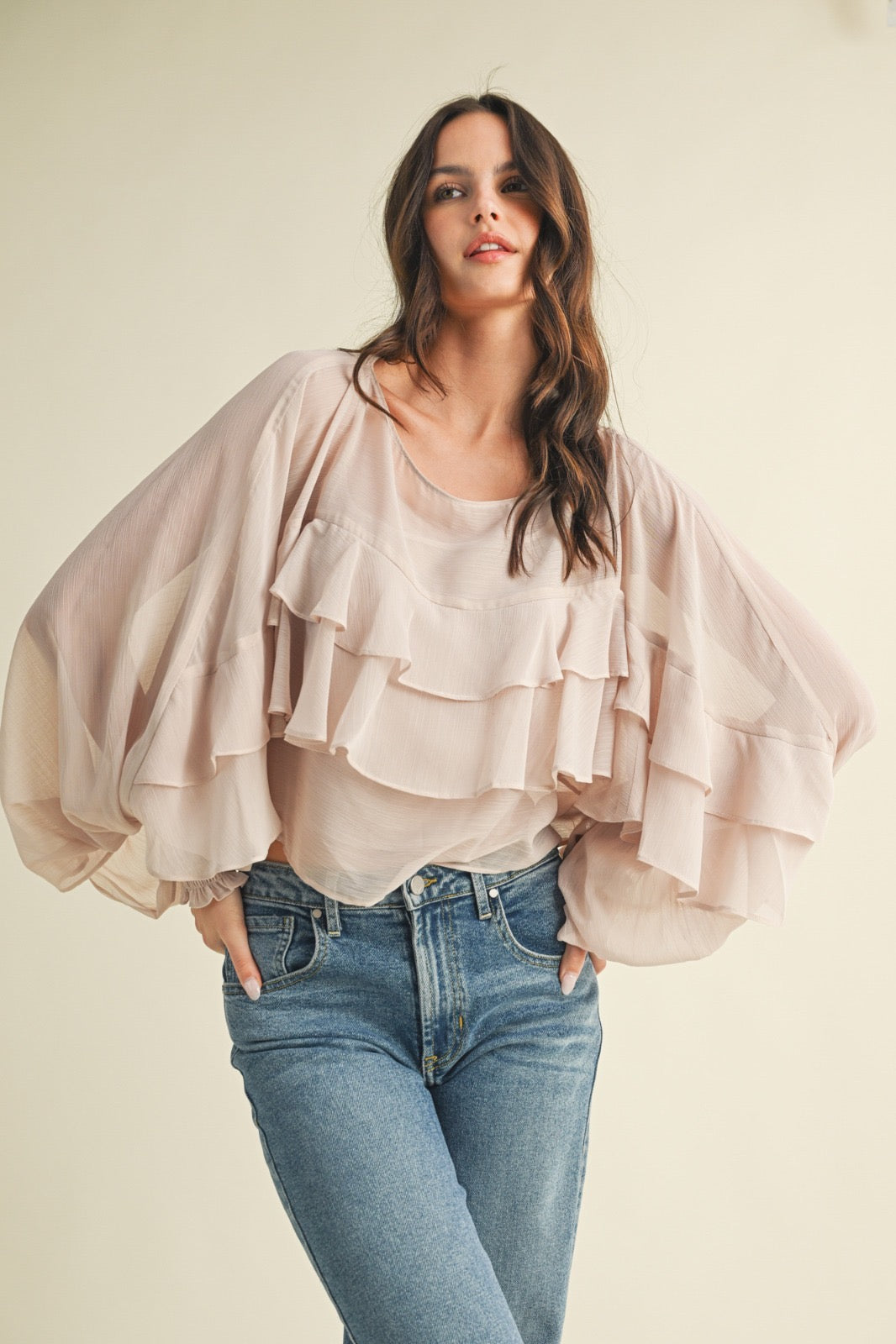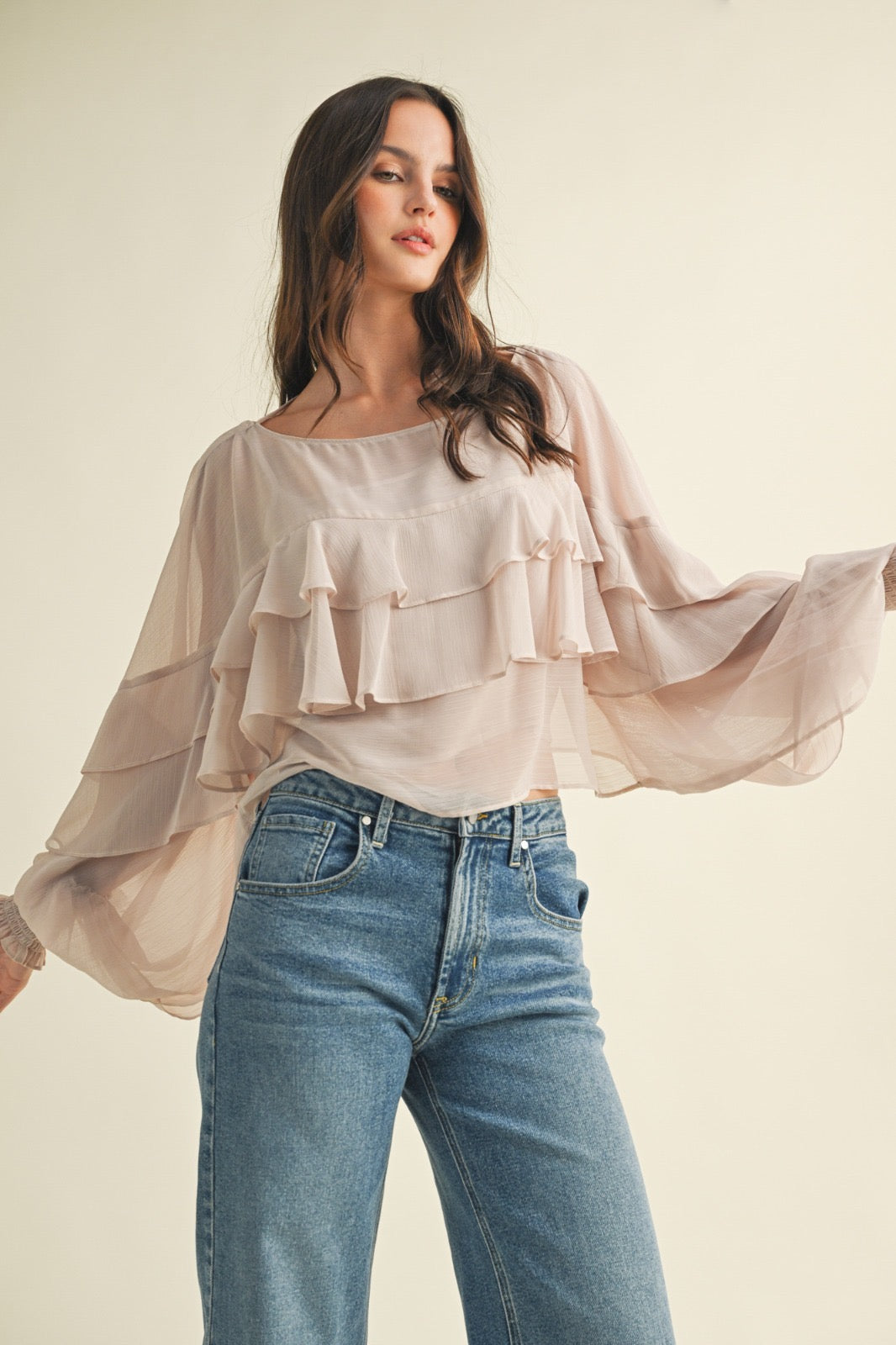 Tiered ruffle batwing sleeve top.