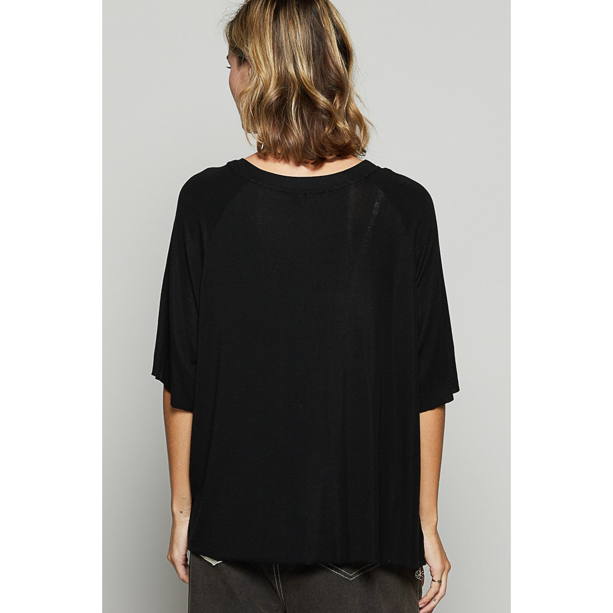 Short sleeve front pocket solid top.
