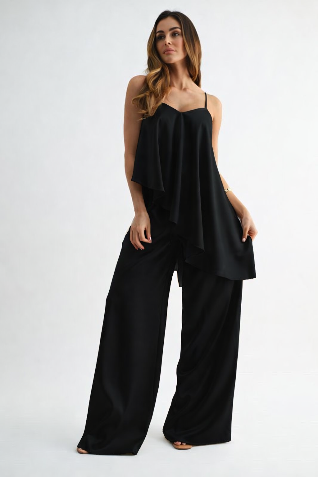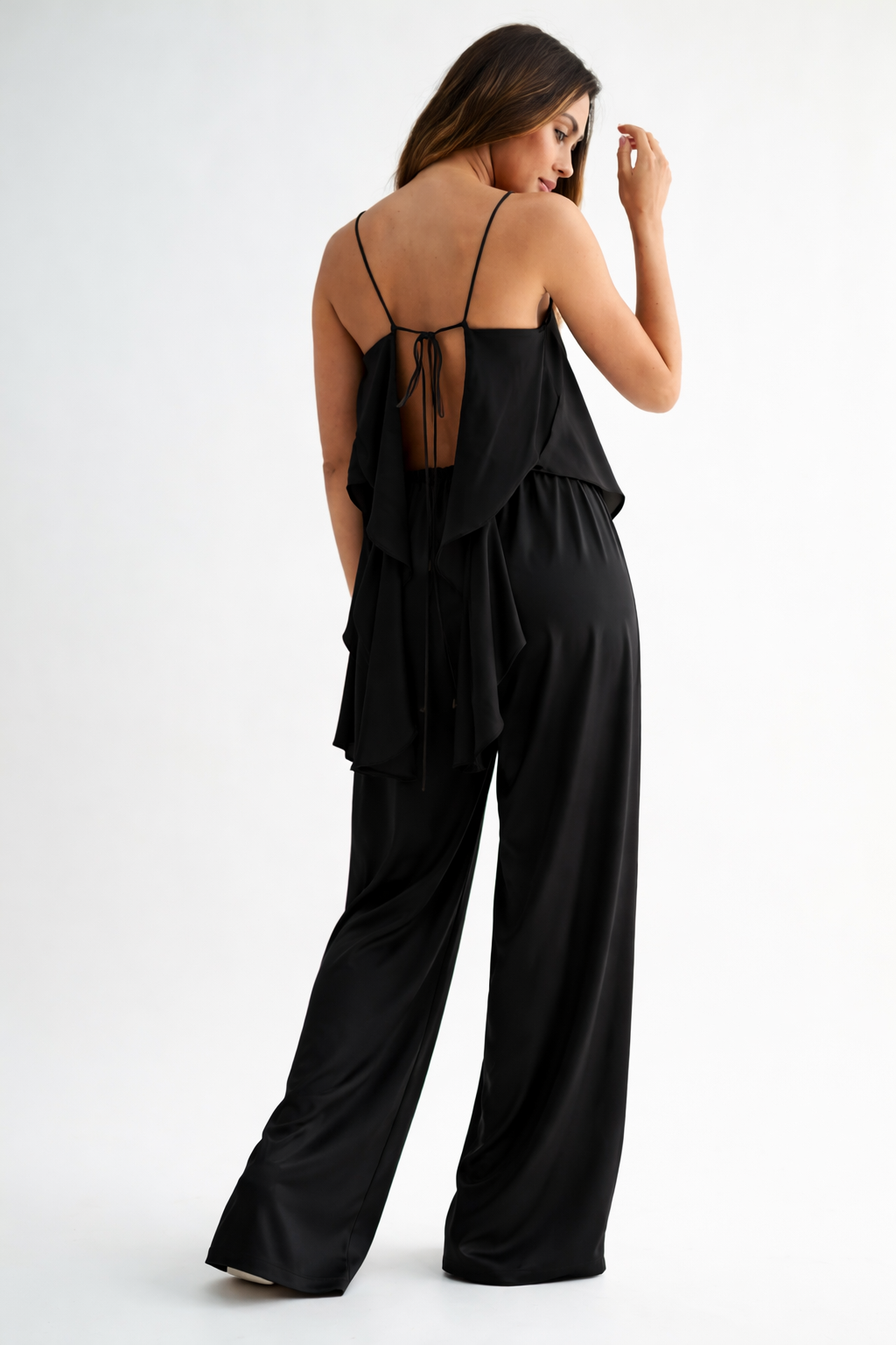 Asymmetrical spaghetti strap open back lace up with matching wide leg pant.