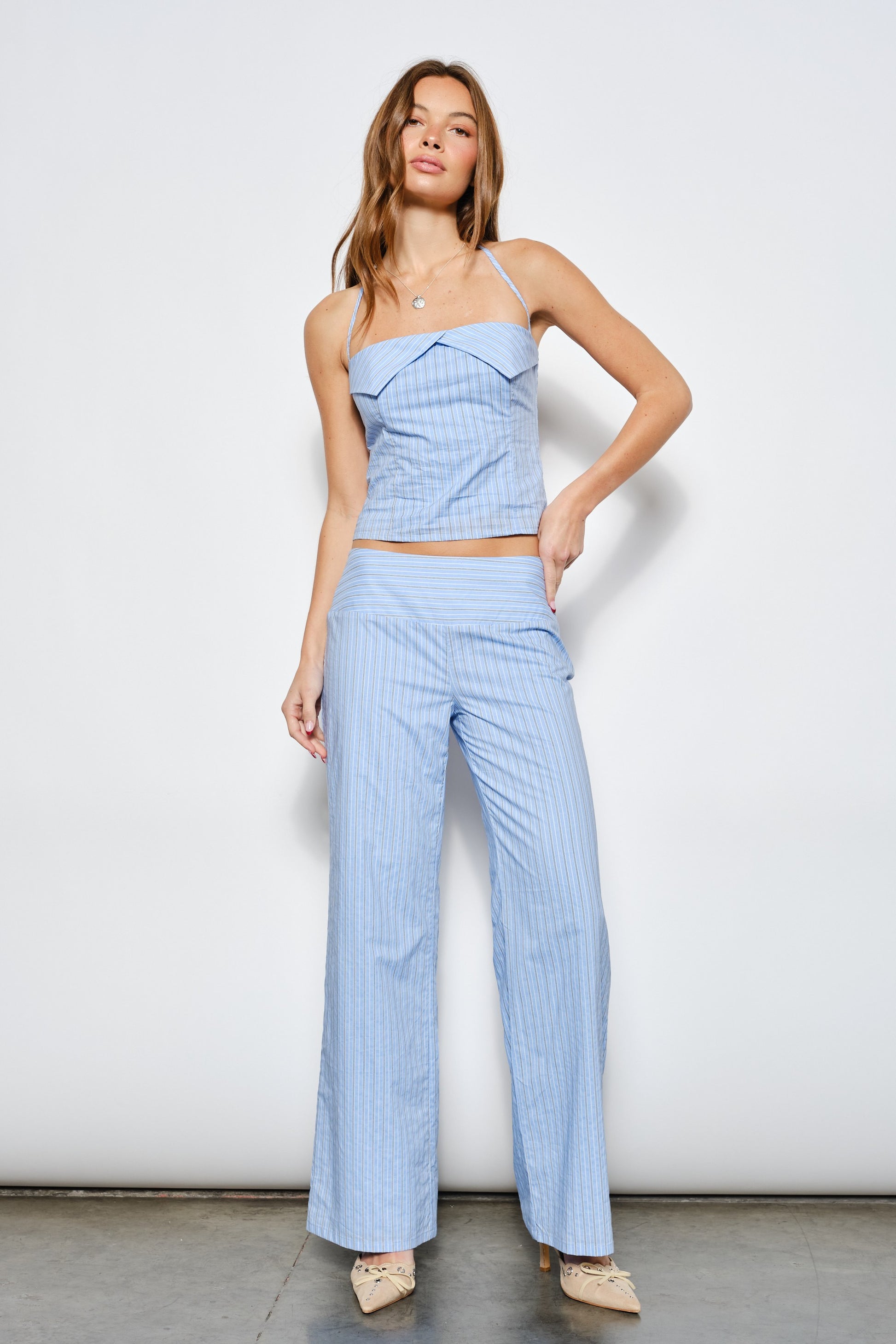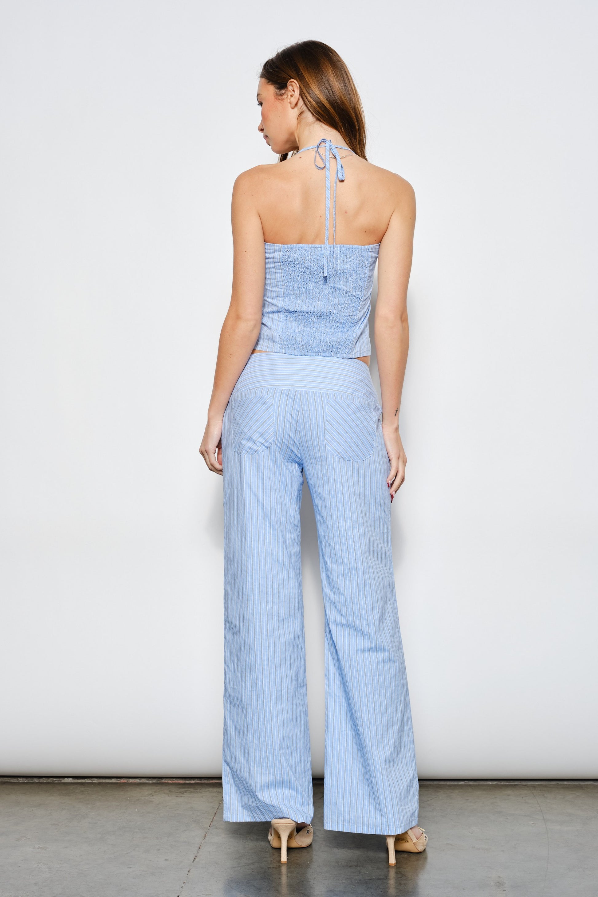 Tie striped halter neck top with matching pant set.