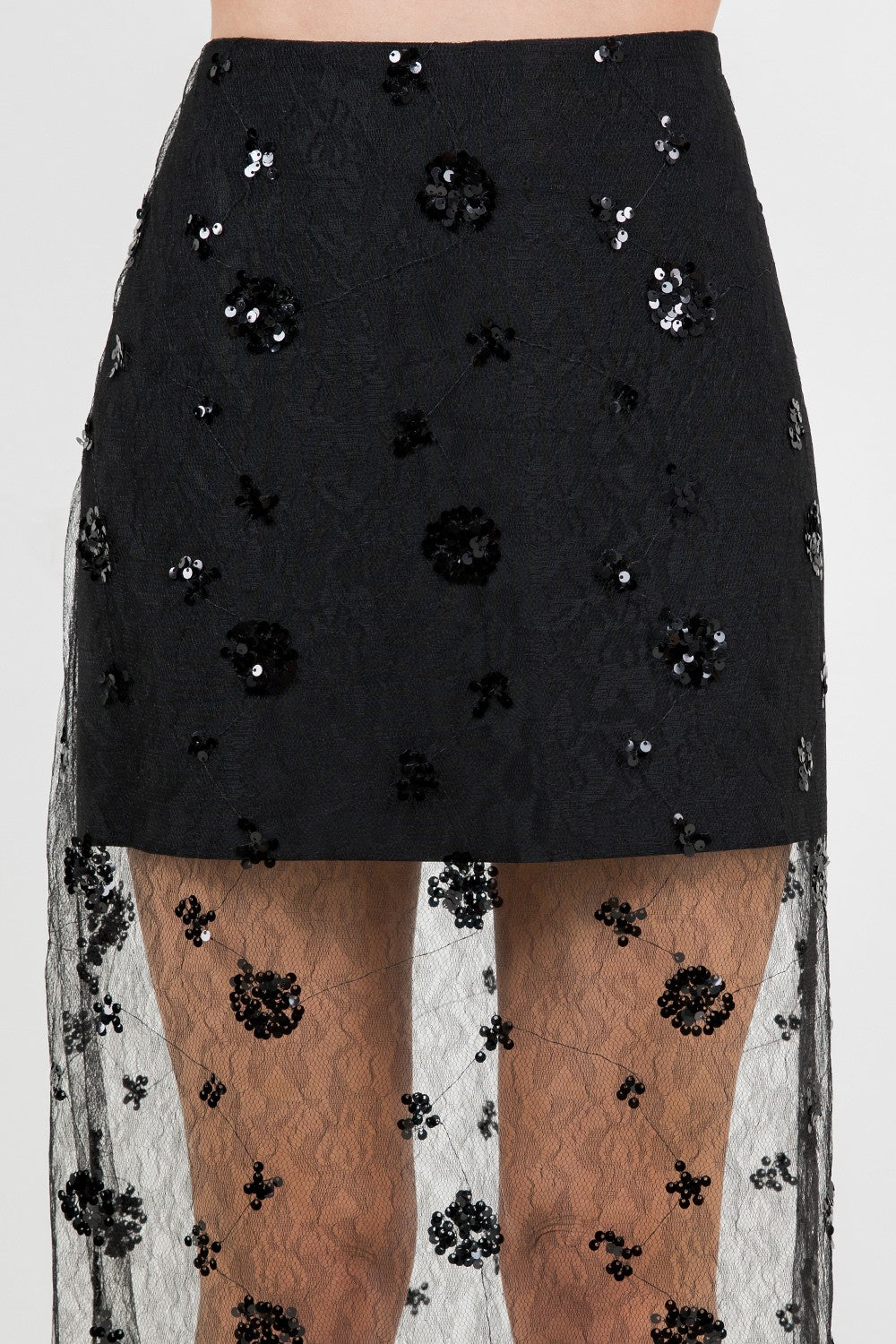 Semi sheer sequined lace midi skirt.