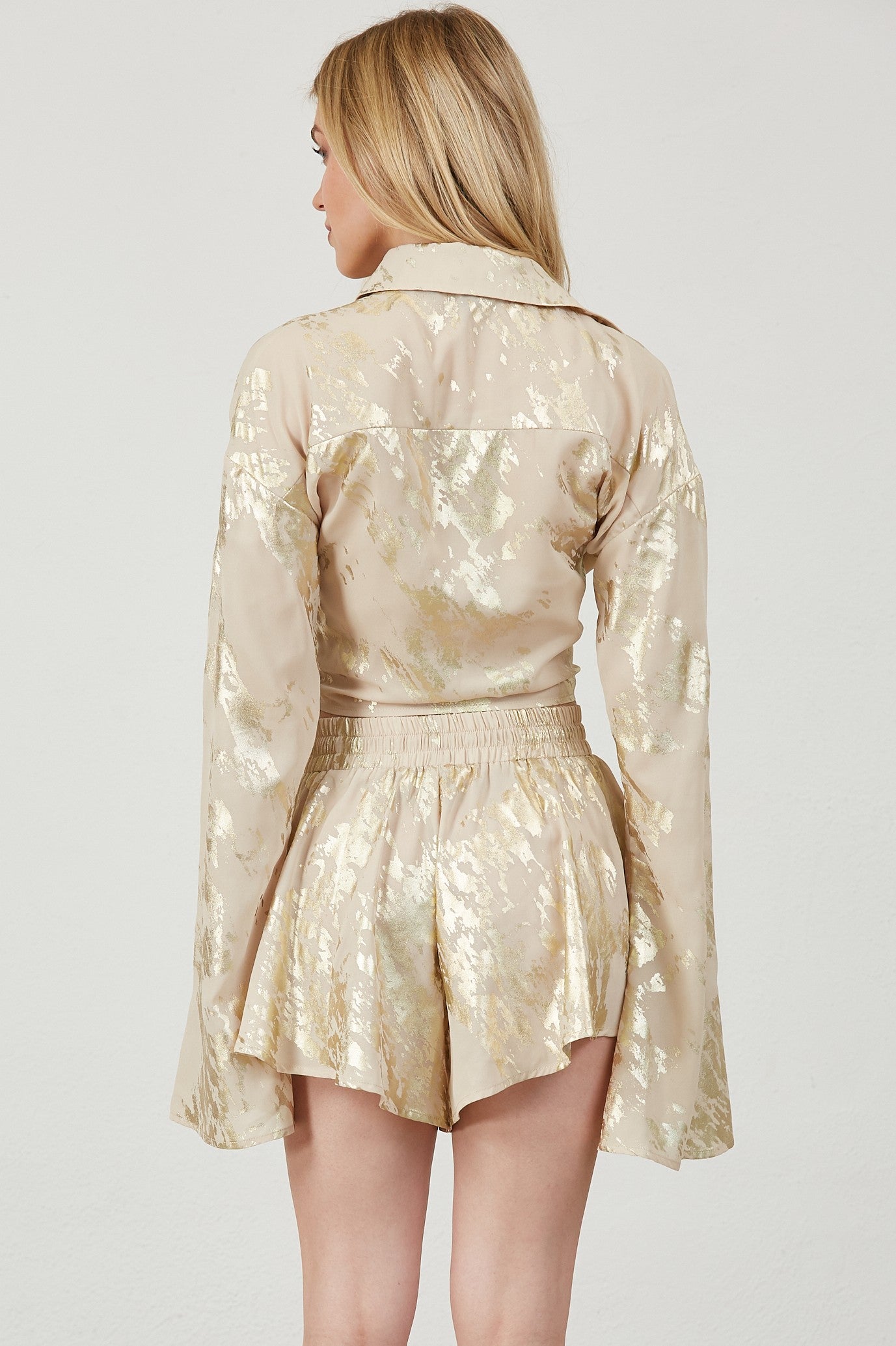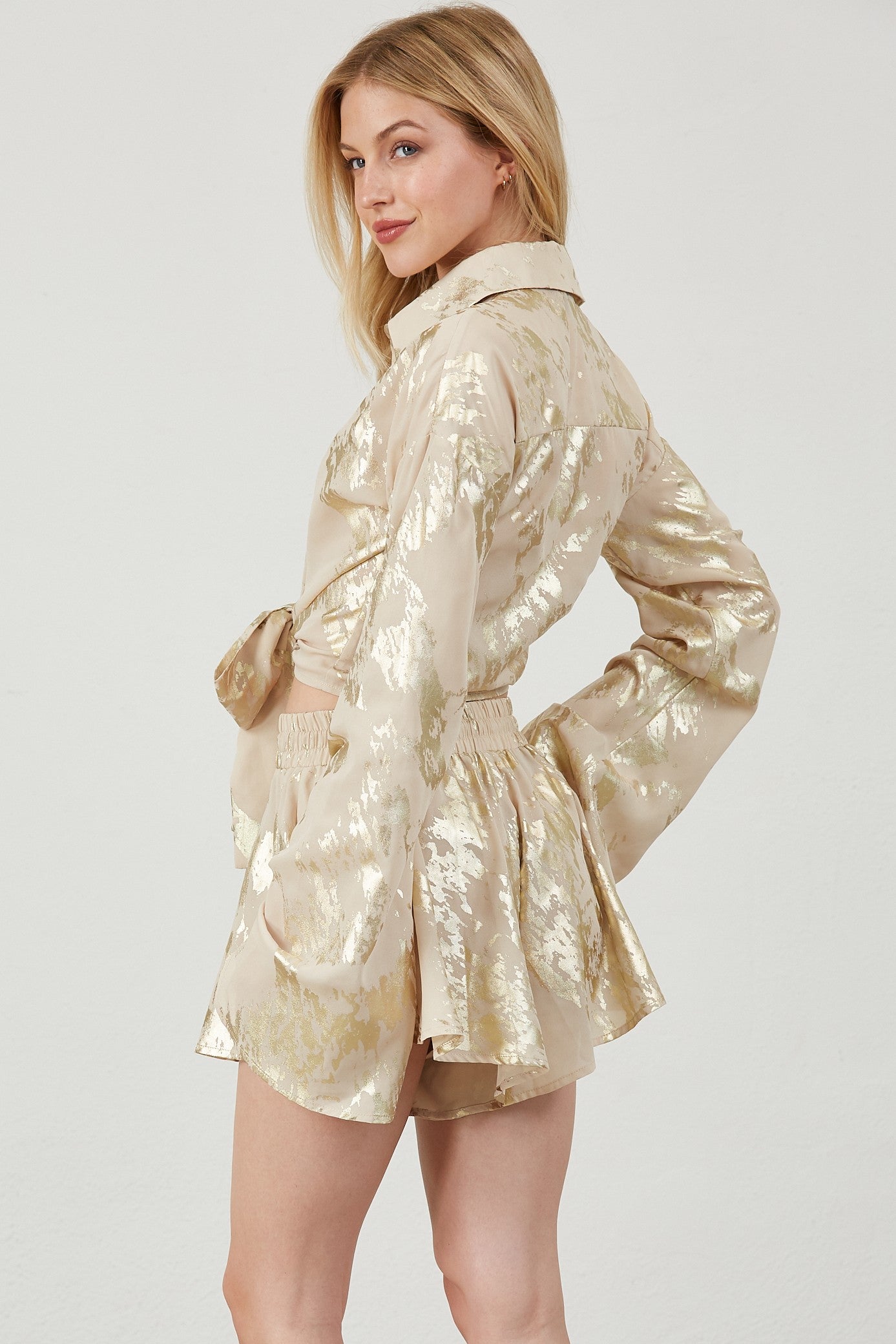 Foil print button down blouse and short set.